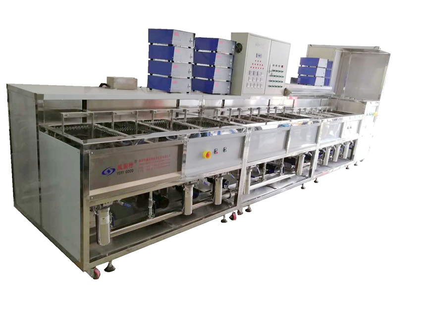 該清洗機(jī)主要由超聲波發(fā)生器、換能器、清洗槽、儲(chǔ)液槽、循環(huán)過(guò)濾系統(tǒng)、自動(dòng)恒溫加熱系統(tǒng)、拋動(dòng)系統(tǒng)、抽氣罩、冷水機(jī)、機(jī)架、電控柜等組成。